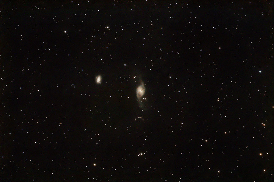 Spiral Galaxies in Ursa Major. NGC3718 - mag. 10.7, 4.7 x 2.3 arcmintues in size. NGC3729 - mag. 11.1, 2.9 x 2.1 arcminutes in size. Five fainter galaxies appear below NGC3718 enlarged and labeled in the insert. |